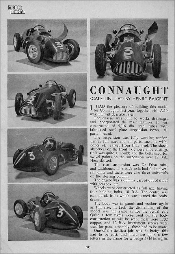 During the 1950s, Henri built several Connaught Grand Prix 2-litre Fuel-injection models from the A-series for David Brown, who backed Connaught. They were all one-twelfth scale. An article written by Henri was published in the Model Maker Magazine about the first A1, see here. They had the usual hand-beaten aluminium bodies. A lot of trouble was taken with the details. The A10 had its fully working suspension made to the actual works drawings. The works were very helpful in providing Henri with all the chassis drawings. Under the bonnet the power-units were detailed. Rob Walker had one of these models for round-the-pole racing, but does anyone know the whereabouts any of the others? I would be pleased to have any leads. In the picture below you can see the suspension under load on the near-side front. The article from Model Maker for Sept 1955 will show the details and photos of the A1. The other pictures on this page and in the article were taken by Henri with his homemade camera.