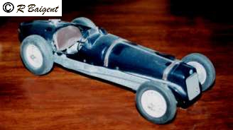The model was made by commission during 1949 and was powered by one of the early production 2.5cc ERE diesel engines, and rigged for round-the-pole racing. This was the only model of this car that we made with this power unit. The model was originally sprayed French Racing Blue with an engine turned chassis. It was fully overhauled after much racing use and a 'flight' off a warehouse roof, at 60mph, onto the ground below! The livery was then changed to dark blue and silver. Most of the pictures here are of the model in its later guise, but the first is shown just after it was first built. The tyres were all wired and taped for speed and moulded in Henri's workshop, thus they were restrained from flying off the rims at speed! See Wheels and Tyres for details of the techniques employed.