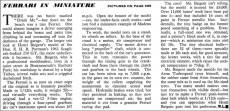 Some years ago, I heard that Baigent was engaged in making a model Ferrari for British sportsman Eddie Portman; it was to be a replica of Portman’s own car, and nothing was to be spared in making the model as accurate and detailed as possible. I’d seen Baigent’s work at firsthand, so I had some idea of the standard of workmanship to expect, but I didn’t have a chance to see the car until it was returned to Baigent a month or so ago for some minor repairs and he offered to show it to me. Well, I finally clapped eyes on it the other day and I was absolutely flabbergasted. I had never in my life seen anything so perfect—it was as if every part of the real thing had been scaled down by some scientific process, perfectly and without distortion. Photographs alone can’t do the model justice, so I’ll try to describe the car in detail, so I'll let you judge for yourself whether it’s worth the price.