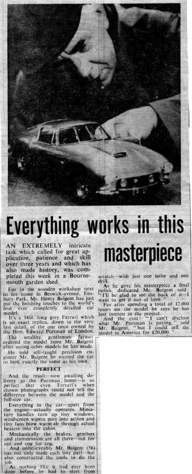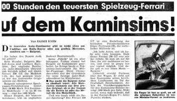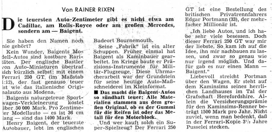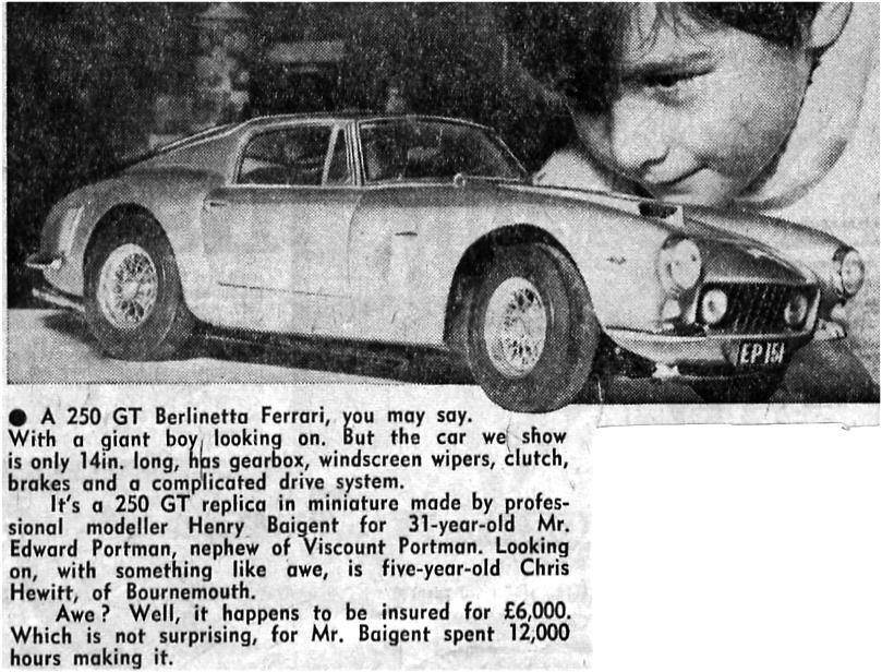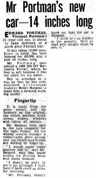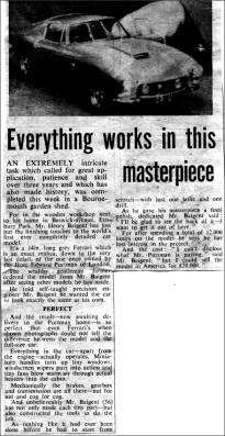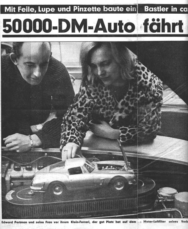 ‘I love cars and I have owned many but to me the Ferrari was the best. So I had the idea of having a model made of it, one as exact as possible, and for this there is only one man.’ Portman lovingly strokes the car. It stands on the mantelpiece of his country house in a valley of the English county of Herefordshire. The insurance alone for the mantelpiece racer amounts to 1,500 marks per year, not too much when you think that there was three and a half years work in the Ferrari reproduction."