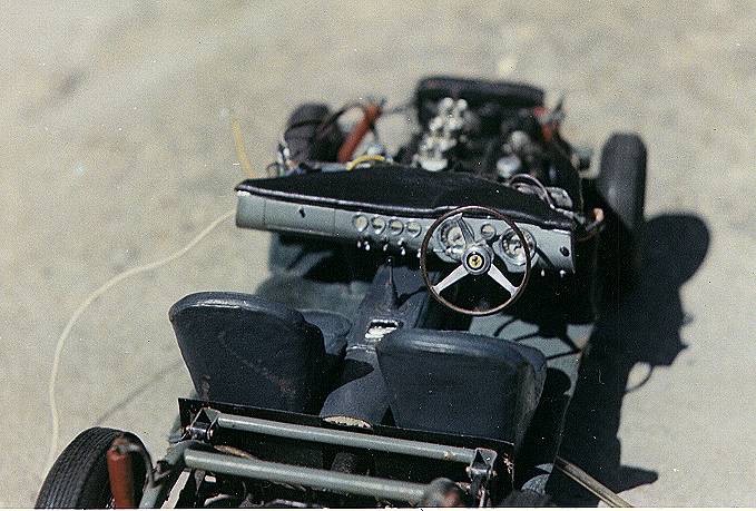 The carpeting and headlining inside the car are original-perfect. The seats were made from the remaining pieces of the leather used in the real Ferrari and, besides being impeccably shaped, they’re correctly sprung. The crackle-finished dashboard contains a full set of instruments with authentic-looking glass dials, and a full set of switches, too. The three-layered steering wheel has alloy spokes, the proper Nardi insert (this was a long time in the making, as the wooden rim sections had to be turned by hand and kept breaking before they could be fitted onto the metal insert) and the famed Ferrari prancing horse on the horn button. The doors have working handles on the inside and the windows wind up and down, while the leather pockets in the bottom of each door, made from the same skins as the seats, are authentically elasticized.