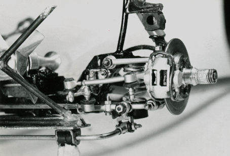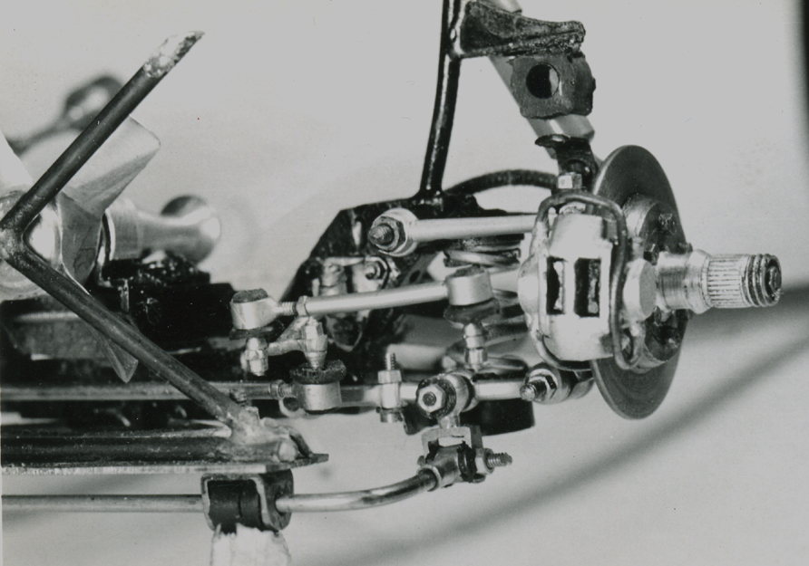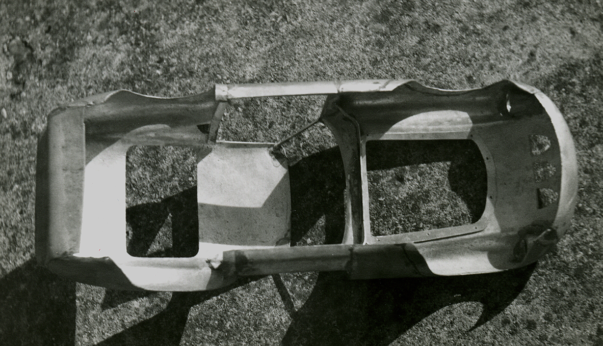 above, the steel body-shell nearly complete and a detail of the off-side front wing