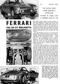 Mind you, this model is something out of the ordinary even for Baigent; normally, he doesn’t spend that much time on a model, but he was anxious to make this one unique. He usually doesn’t make more than one model of a particular car, though he has made other Ferraris, such as the beautiful model of driver Innes Ireland’s GTO he did for the Rosebud racing people. But he won’t make another Ferrari to the 250 GT standard, although he might produce a similar model of another make if someone asks him to. His next model will be a replica of Tommy Rose’s vintage Le Mans Bentley. and I, for one, can’t wait to see it. I think Baigent prefers to make models of the older cars, since you can see the workmanship that goes into them more easily. Most of the fantastic work that’s gone into the Ferrari, for instance, is hidden by the beautiful bodywork, and you don’t realize what’s there until it’s all explained to you. In that respect, Baigent told me that a Rolls-Royce Ghost is the one he really wants to duplicate. I only wish I could afford to commission it—the result would certainly be worth seeing.
