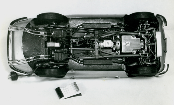 But I’ve saved the best for the last. The model is designed to be displayed on a special rotating stand. The wheels are mounted on rollers, and the stand rotates slowly to give an all-round view of the model. An electric motor on the stand drives the model’s engine through a universally jointed drive shaft; there is a cable that carries power to a two-volt transformer, which in turn powers all the model’s electrical equipment. This means that when the power is on, you can drive the engine of the car, working the clutch, gearbox and final drive in the proper manner. You can brake, and you can steer the car with the steering wheel. Not only that, but you can switch on any of 30 lights in the car, from the special three-volt head-lamp bulbs to courtesy lights and lights in the instrument dials. The directional signals work from switches on the dashboard and the head-lamp flasher is operated from the steering-column control; the twin horns work, too. Brake lights function when the brakes are used, and the windscreen wipers are driven by their own tiny motor, hand-wound by Baigent and fitted carefully under the hood. And, most fantastic of all, the speedometer and tachometer actually work, with the former showing the speed at which the rear wheels are turning on the rollers and the latter indicating the engine revolutions—these on dials about as big as the head of a pushpin (the tachometer has to contain a solenoid and three bulbs in that space). There’s also an electric heating element, fan and thermostat that keep the inside of the model at a steady 75 degrees for the comfort of driver and passenger.