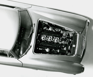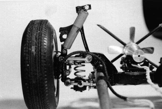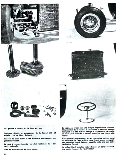 The engine is extraordinary; and not only is its exterior perfect, with all the components and auxiliaries exactly reproduced (including the alloy carburetors with polished air intakes and the crackle-finished cam covers with raised fins and the name Ferrari embossed on each of them), but all the moving parts inside work as well. The radiator in front of the engine is made up of 160 separate leaves and contains 48 tubes, all so carefully made that the whole system will hold water under pressure.