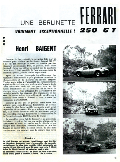 THERE'S THIS FERRARI 250 GT—beautiful job, finished in metallic blue-gray with blue leather upholstery, V-12 engine with three twin-choke Webers, twin distributors and fuel pumps and ignition systems, four-speed all-synchro gearbox, Borrani wheels with four new Avon Turbo-speed tires, heater, power brakes, one careful owner from new, an absolute steal at $12,600—and it’s just over a foot long. That comes out to about a thousand dollars an inch!