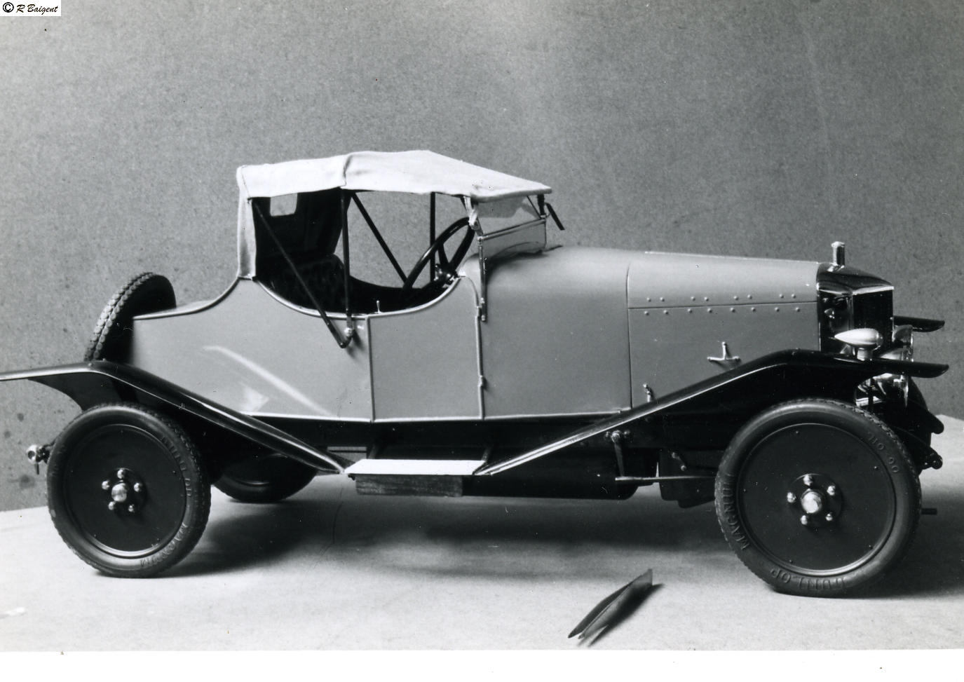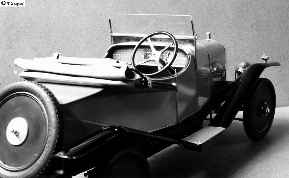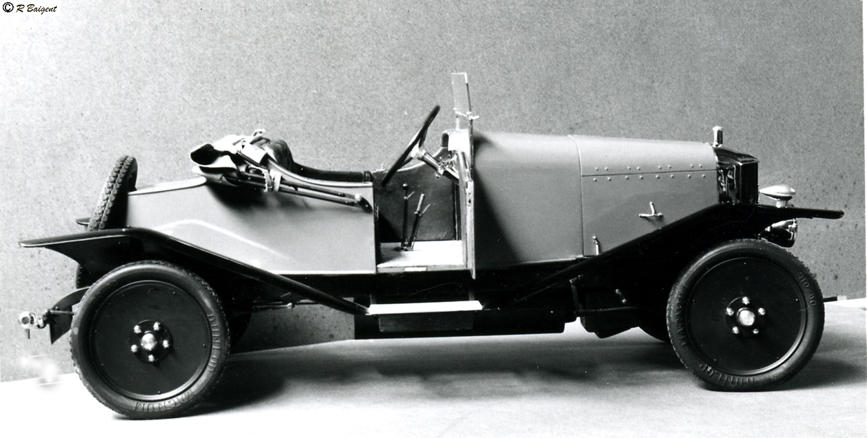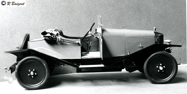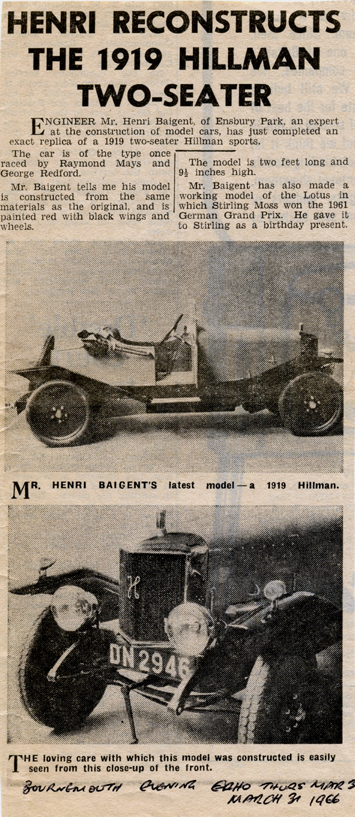 Early 1963 Henri started a project for Mr C T Black. It was a 1919 Sports 2-seater Hillman registration number DN 2946. According to historic records this was the car that was driven by Raymond Mays and George Redford. The model was 1/6 scale, that is 24in long x 9in high. Mr Black provided the original blueprints for Henri to work from.