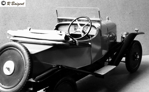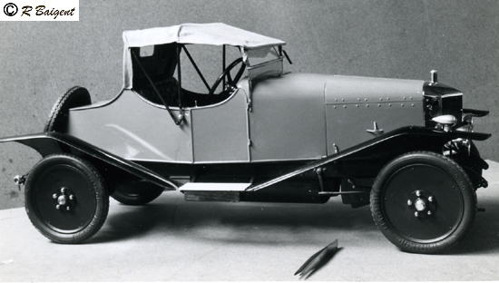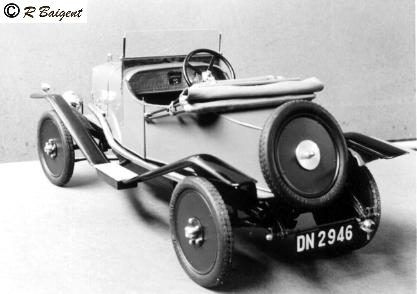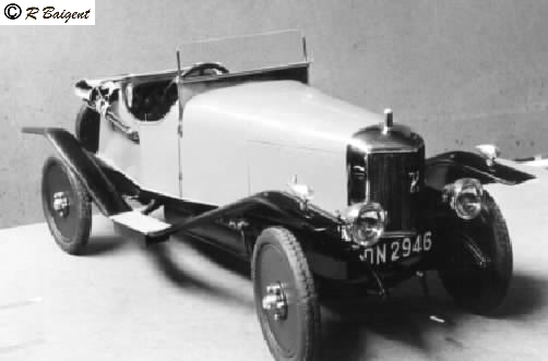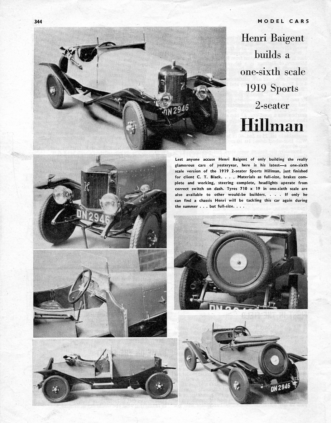 "Lest anyone should accuse Henri Baigent of only building the really glamorous cars of yesteryear, here is his latest--a one-sixth scale version of the 1919 2-seater Sports Hillman, just finished for client C J Black.....Materials as full-size, brakes complete and working, steering complete, headlights operate from the correct switch on the dash. Tyres 710 x 19 inch....."