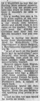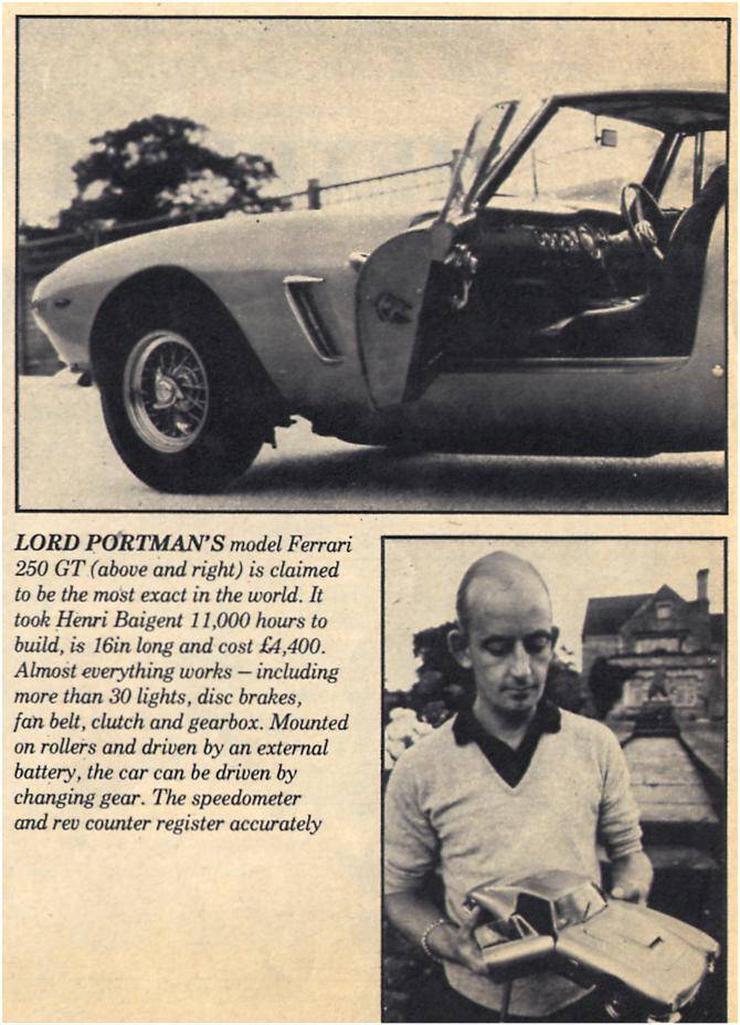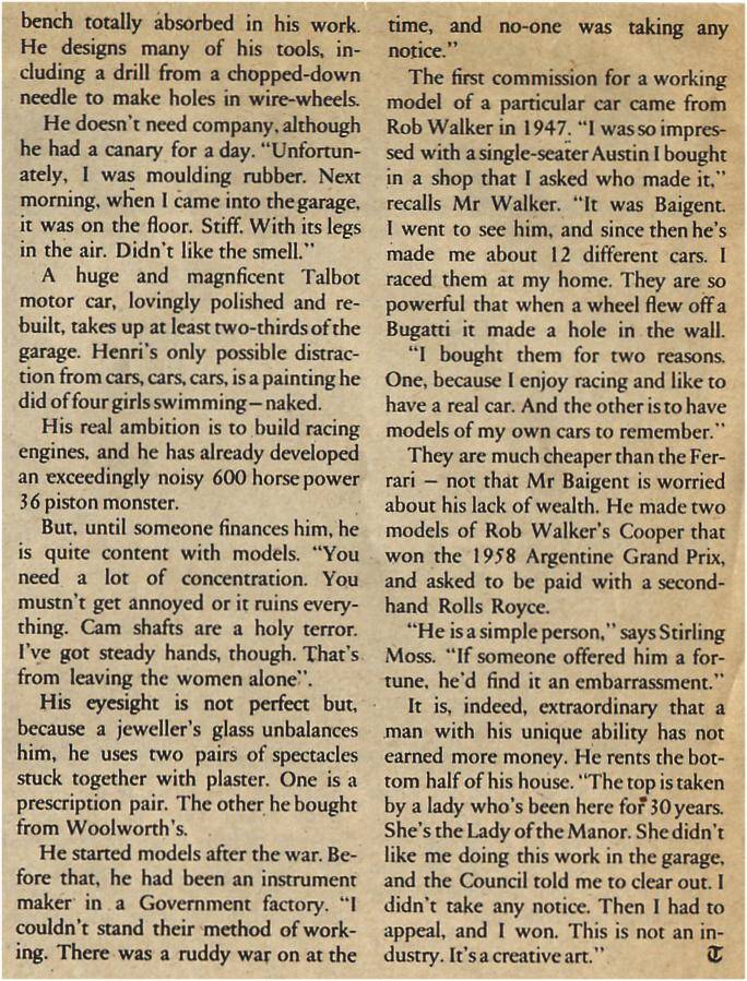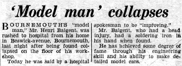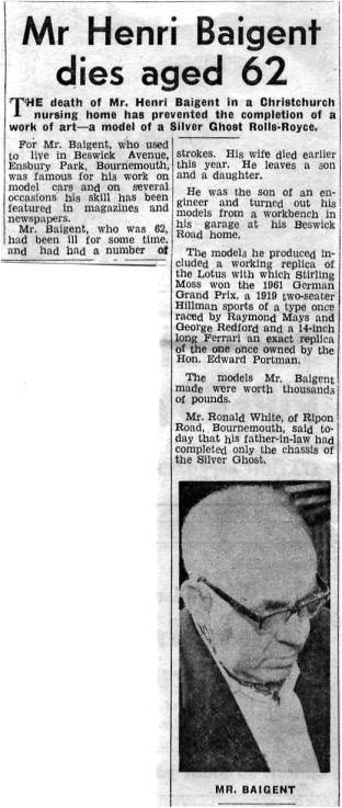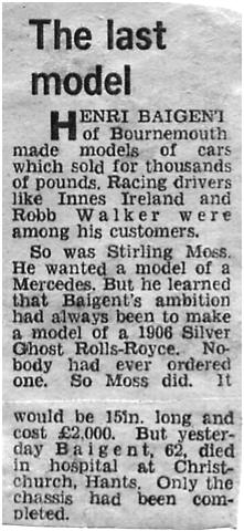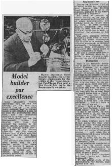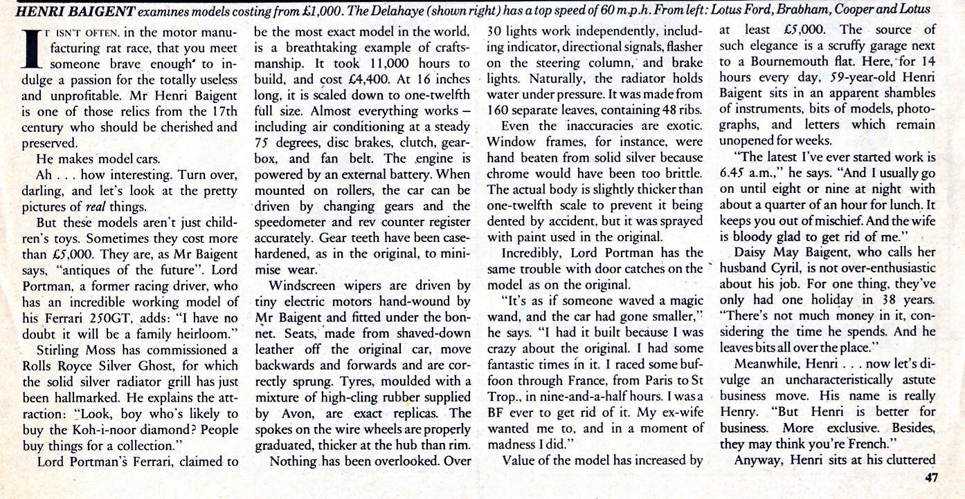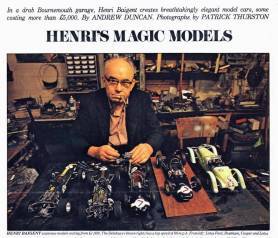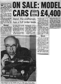 During these later years much interest was shown in Henri and his work. He appeared in various magazine articles and on South Today Television on Thursday 18th January 1968. Also he was interviewed on BBC Radio on the 4th January the same year. Everything was swinging along for him. I thought that he had achieved recognition for his work and was going to have a better income. Then, I first noticed that his Jaguar became somewhat dented around the bumpers (fenders) when he had been out to play golf. He changed it for an Alfa Bertone Coupe. That caught the same disease! When I mentioned it, he told me somebody had bumped him in the club car park. I knew later that he couldn't see properly to drive. It was not long before he had another stroke. He already had two by then. Each time Daisy May had found him on the workshop floor, but he bounced back. We thought it would be the end of his modeling, but it was not. He went on to build more models.