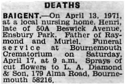 When I visited them, early January 1971, both my parents became very anxious but they would not discuss his problems with anyone, not even me. They would eat very little, virtually living on cream-cracker biscuits and my mother was losing weight rapidly. I realised later that they did not have enough money to have proper meals. Daisy May's cancer was considered to be cured but it had spread to her abdomen and had become inoperable. She was suffering stoically without mentioning it to me until she was taken into hospital. When the ambulance had gone, I took Henri to my home to help him cope and recover. Early next morning my mother died. That same evening, Henri had a brain haemorrhage and was taken to Swindon Hospital. He lost twenty years of his memory, but survived again. He was transferred to Christchurch Hospital, near his home, but while there he had several more strokes, and finally died on April 13th 1971.