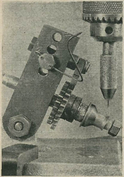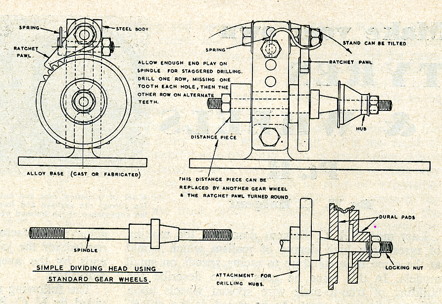 Correct spacing of spoke holes in the tiny hubs and rims is ensured by means of this simple home-made dividing head, details of which are shown on the right. The outer hub spoke holes are being drilled in the picture above.