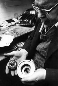 One of the really almost insurmountable problems in modeling cars was the production of wheels and tyres that do not look like toy ones. Henri delved into rubber moulding and produced his own tyres. These were developed from around 1947, when as far as I know, this process had not been considered. Some of the earliest tyres are shown in the pile below. A note that a national journalist made on the reverse side of the photo was, "Fort Dunlop? No, just a pile of Baigent's own moulded racing tyres looking for all the world like the R3 pattern." It was a part of my personal responsibilty to make considerable numbers of these for sale to other modellers during the early days of our development.