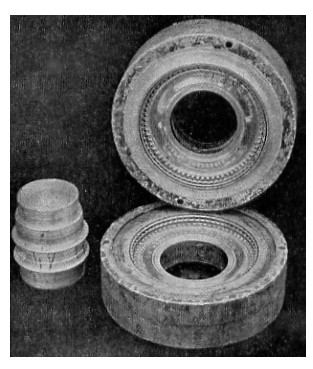 Now for a few if's and but's, do's and don'ts. One, of the photos shows how your tyre should look when you take off the first half of the mould. To get the tyre out of the other half, knock the core through from the other side and the tyre will come away with the core, and you can then pull the tyre off the core. Don't prize it off with metal objects, pull it off by hand, using gloves or something to protect the fingers. If you have had insufficient heat your tyre will be all sticky and a proper mess. In this case add a small amount of gum, reheat the plates, a little hotter this time, and put it in again; this has no ill effect on the finished tyre.