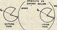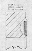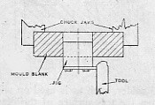 Before making the moulds I first determined the shape by scaling down a full-size tyre and making a cross-sectioned drawing to the size wanted. A form tool was now made to match half of this, thus ensuring that both sides of the mould would be the same. The tread grooves have to be put on after the forming. A gauge must be made to locate the form tool to ensure centralization. I made a plug to fit core of mould (in my case 11/4 in.), and bolting to the face of this a plate, using the end of this as a stop to bring my form tool up against before entering. After the form was cut I cut in 2 1/2 in. grooves, the half of one groove making a whole when we contact the other half of mould, but the design of tread depends on what you wish to copy; you can't very well copy the larger tyre treads exactly as this would mean an engraving machine, but you can simulate the main pattern.