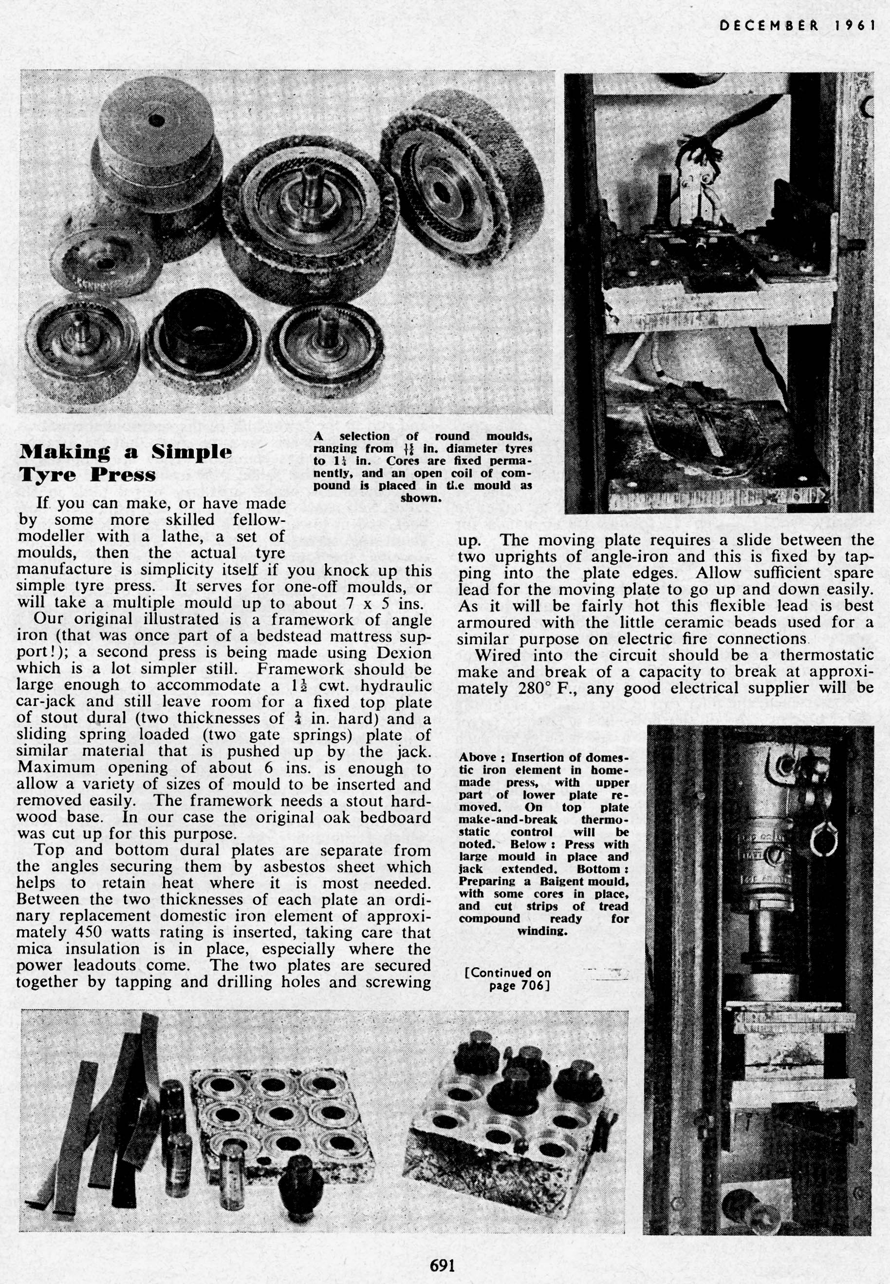 Anyone can make their own tyres provided they have a normal workshop, the main essentials in which are a small lathe and a large vice or a small press (a book press will do). There are one or two smaller essentials, but these can be obtained for a few shillings. The main things are two metal plates as massive as possible to, retain the heat; I use two pieces 6 in. wide, 10 in. long, and 1 in. thick these are of steel and can be bought at most metal dealers, as they are cut off standard rolled bar, which also has the advantage of being of equal thickness. Secondly a piece of round dural or, aluminium for the mould, the size of this depending on the size of the tyre. If I come up against any difficulty in obtaining large diameter dural I melt a scrap dural and run it in a deep tin lid and work from that.
