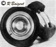 above, high-speed 'pneumatic' light weight wheel and tyres, wire beaded, and capable of withstanding the forces of rotating at 30,000rpm. Special wheel design with a split rim enabled the tyres to be fitted without straining the beads. Wheel and tyre weighed 1oz (3gr), and were 2.25in in diameter. The price charged was 15 shillings each wheel of this design in 1949.