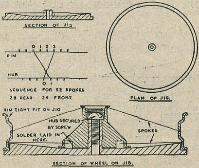 You can now finish the back row and sweat in the centre by holding the jig complete over a flame, and when hot drop some Baker's fluid round the hub and it will be found that the solder you have placed in the cavity will come through and run all round the spokes. (Only fix hub spokes at this stage -all the ends in the rim are fixed last.) Now slip the whole in cold water. This normalizes the Baker's fluid and stops it corroding the jig, which as you see must be dural or the whole thing will become soldered solid