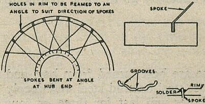 Now file off any surplus spoke ends that protrude through the rim, then round the two rows together. I find it's best to preheat the whole over a flame and introduce flux when hot, then when you run round with the iron and the solder runs easily and through the rim and makes a very solid job. Now dip the whole again and remove from the jig, and you have a finished wheel which should be dead true and a pleasure to look at. It is now ready for plating. I have had quite a lot of bother getting these small wheels plated satisfactorily, and have fitted up a small nickel bath which gives very satisfying, results, and I shall be following this article with full details of construction and working of a small plating bath.