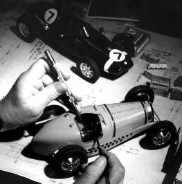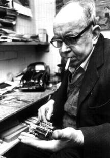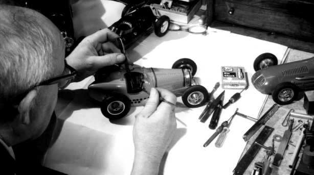 Left: Henri checking the Ferrari Berlinetta, just look at that crowded tool-bench; and right, building the 1909 Rolls Royce Silver Ghost chassis